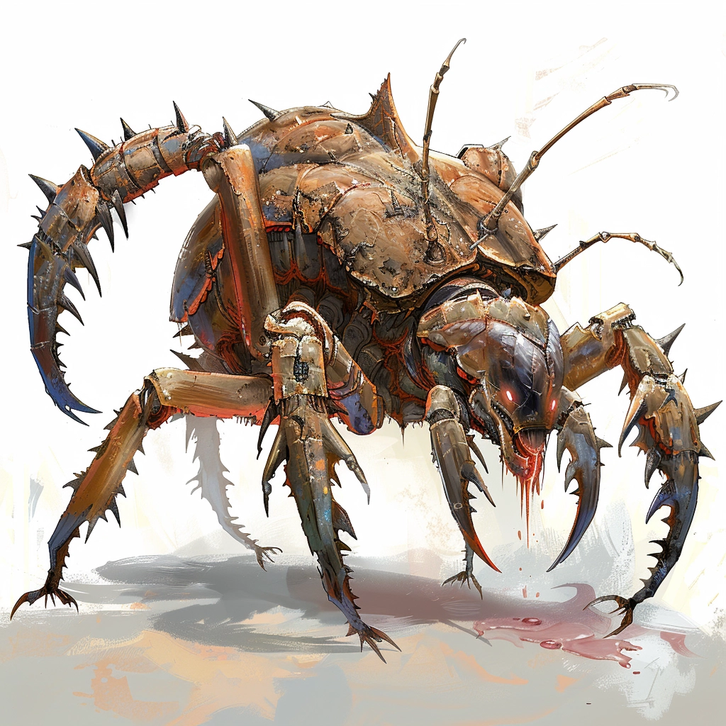The Aggrocrab's form is a marvel of natural selection, perfectly adapted to its niche within the ecosystem. Its shell, a masterpiece of organic armour, is composed of layered chitin that can withstand tremendous pressure and blunt force. This exoskeleton is regularly shed and regrown, allowing the Aggrocrab to repair damage and grow throughout its life. The creature's eight legs, each articulated in multiple joints, provide not only mobility but also an uncanny ability to manipulate its environment, secure its footing on slippery surfaces, and create burrows for shelter. The Aggrocrab's claws, its most distinguishing feature, are powerful tools for both offence and defence. Capable of snapping bone and chitin alike, these claws are also used with surprising delicacy when interacting with objects or during social gestures within their species.